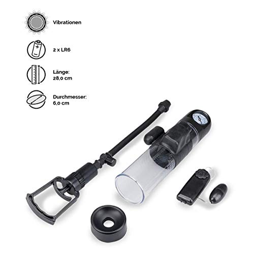 Bedienung: Schließen Sie die Handpumpe an den Zylinder an und setzen Sie den Aufsatz auf die Öffnung. Achten Sie darauf, dass alles luftdicht abschließt. Betätigen Sie die Pumpe. Wenn Sie die Vibrationsfunktion nutzen möchten, legen Sie zwei LR6-Batterien in das Batteriefach der Fernbedienung ein. Schalten Sie die Fernbedienung ein und wählen Sie die gewünschte Intensität, indem Sie an dem Rädchen drehen.